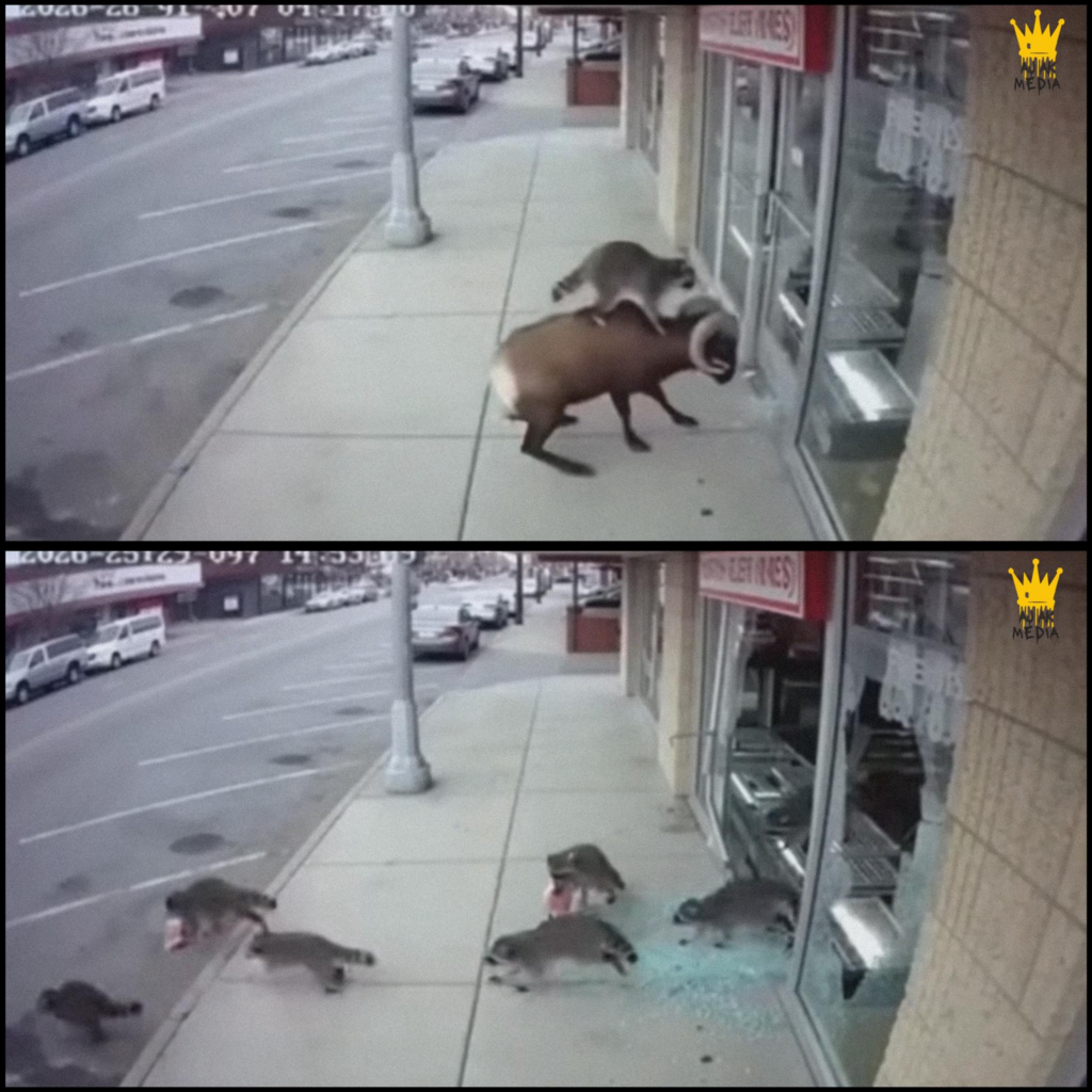 In a story that seems ripped from a cartoon, residents of a small town woke up to news of a bizarre overnight crime: a coordinated heist at a local grocery store pulled off not by humans, but by a gang of raccoons with the help of a rogue ram. CCTV footage, which quickly went viral, shows the ram charging headfirst into the store’s side entrance with what police described as an apparent “raccoon ringleader” perched on its back, gripping its horns as if steering the animal like a furry jockey. The door gave way under the impact, and within seconds, multiple raccoons swarmed inside, ransacking shelves and freezers for snacks, bread, and packaged goods before scattering into the night.