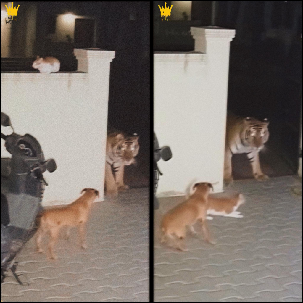 In a quiet Indian village, a wild tiger, likely displaced from its territory, slipped through a loose gate into a family compound. The resident guard dog, sensing the overwhelming power of the apex predator, did the only rational thing: it froze, knowing it was hopelessly outmatched. But rationality was not on the mind of the local ginger alley cat. From its perch on a wall, the cat witnessed the intrusion and, in an act of astonishing bravado, dropped to the ground and planted itself directly between the massive tiger and the terrified do