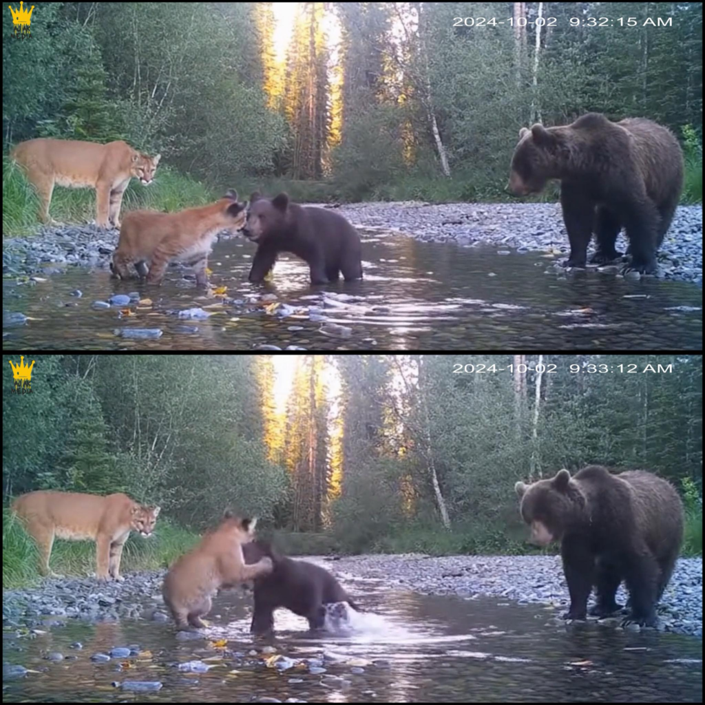Deep in a North American wilderness, a trail camera meant to document solitary predators captured a scene that defied ecological expectations: a mountain lion and a mother grizzly bear standing calmly shoulder-to-shoulder at a river’s edge, their respective cubs splashing and playing mere feet apart. In the brutal calculus of the wild, such encounters typically trigger immediate flight or violent confrontation, as apex predators compete for territory and resources. Yet here, an unspoken truce hel