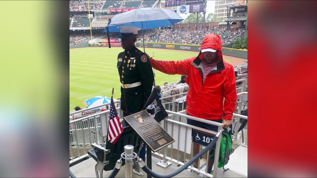 During a rainy Braves game, a fan held an umbrella over a Marine Corps JROTC cadet standing at attention beside the POW MIA Chair of Honor. The quiet gesture reflected respect and thoughtfulness without seeking recognition.